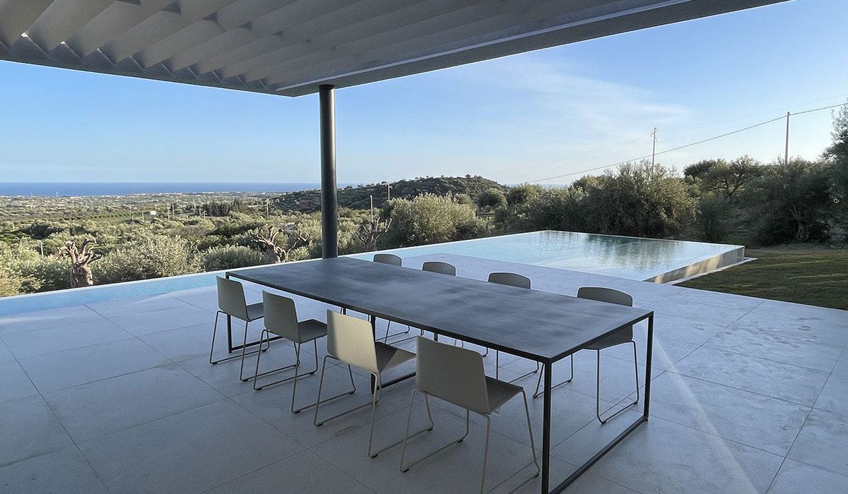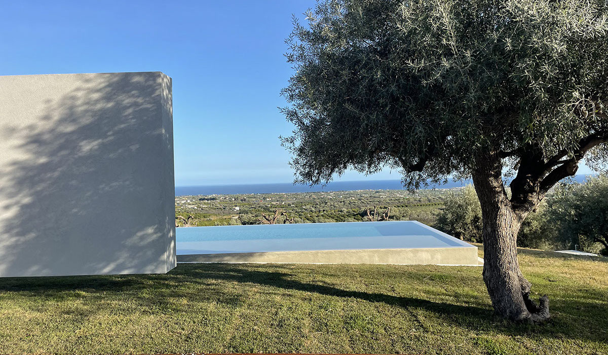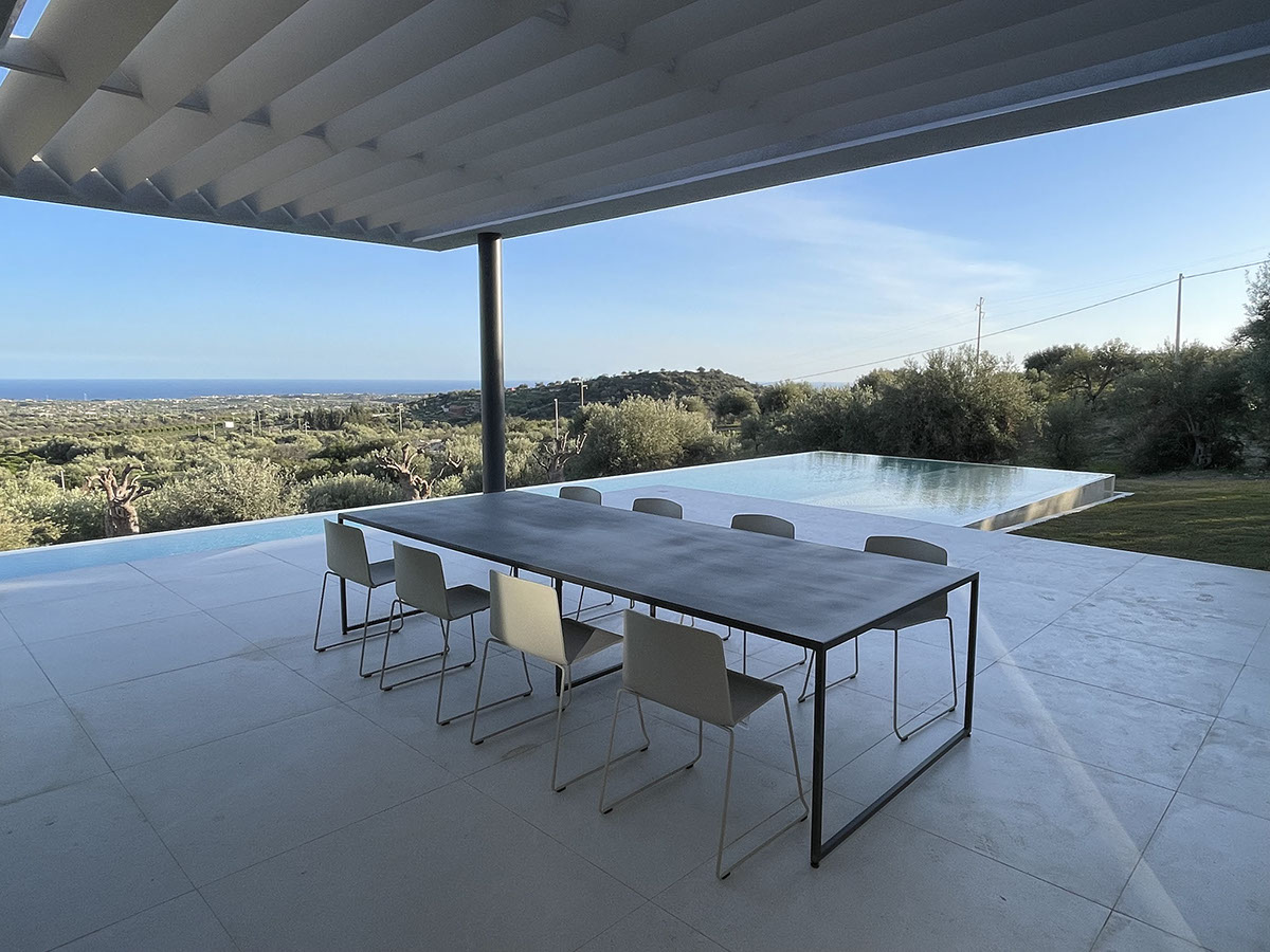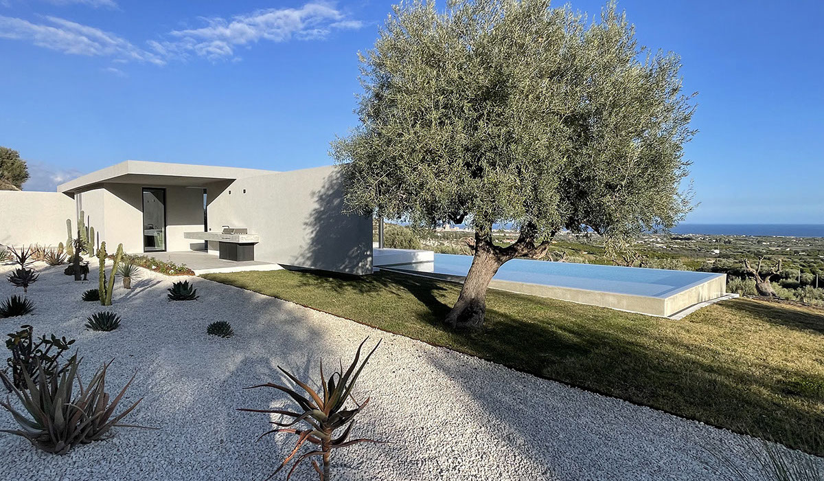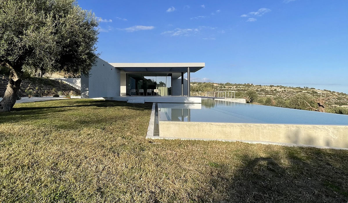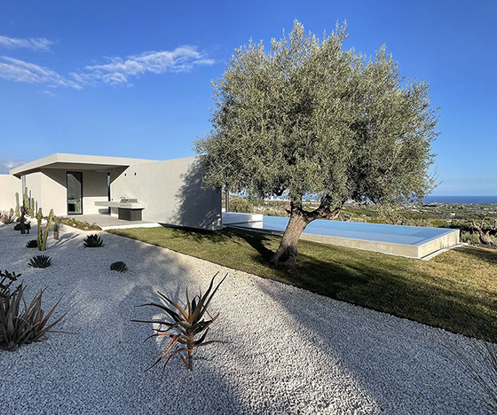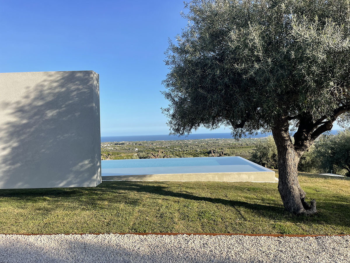 villa unifamiliare vista mare con piscina a sfioro realizzata all'interno di un verdeggiante uliveto a pochissimi km dalla Città di Noto