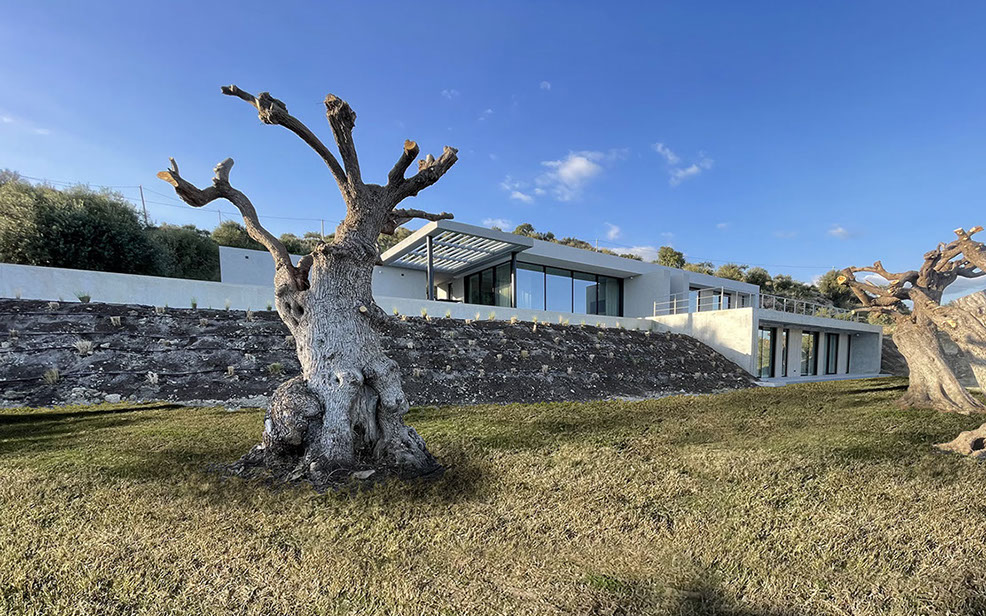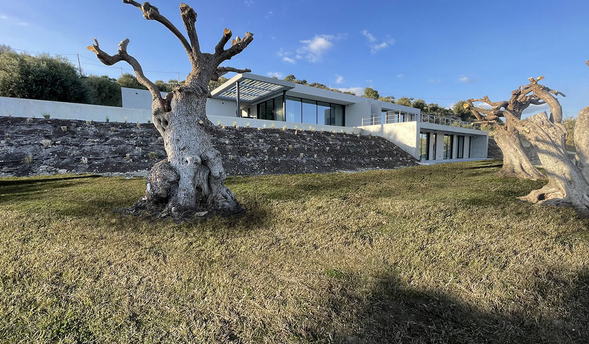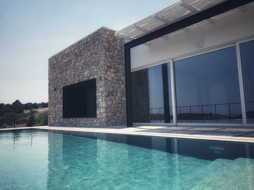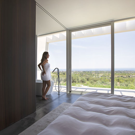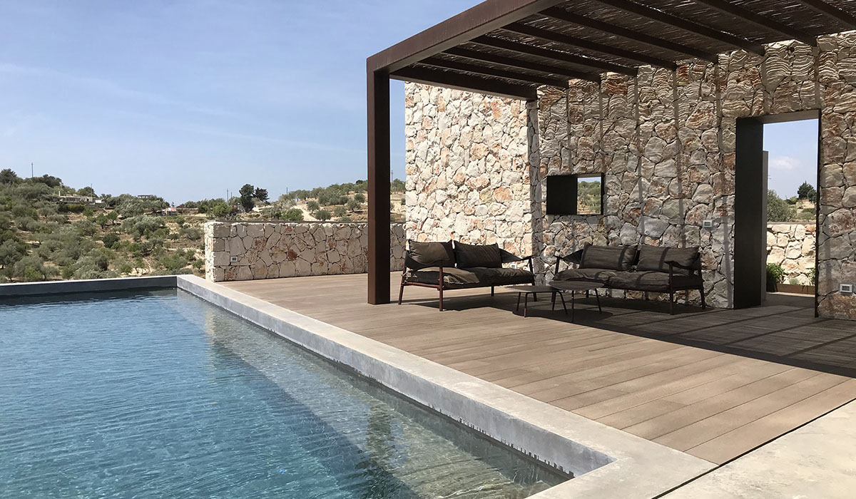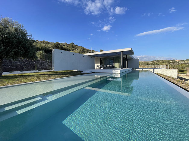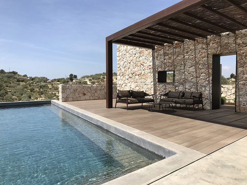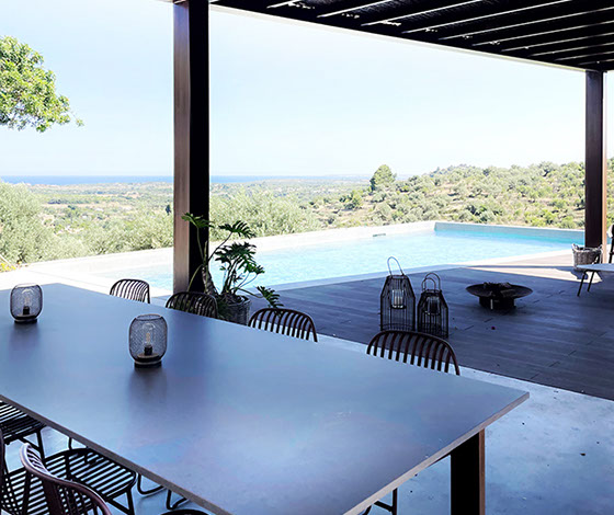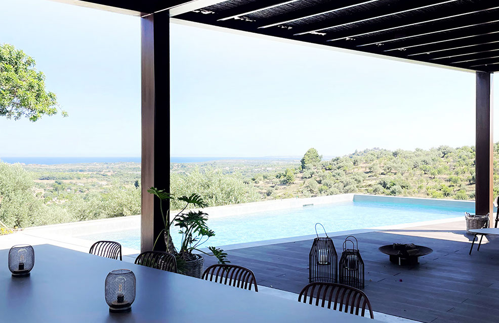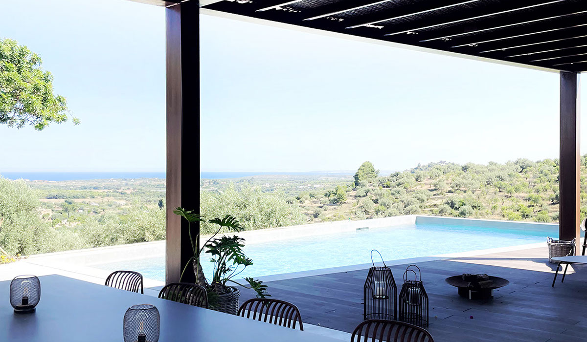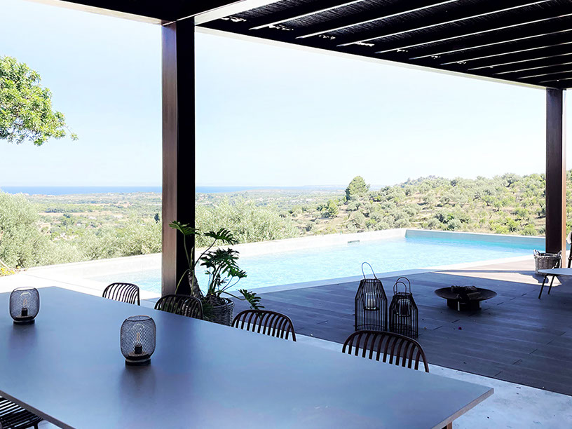 villa unifamiliare vista mare con piscina a sfioro realizzata all'interno di un verdeggiante uliveto a pochissimi km dalla Città di Noto